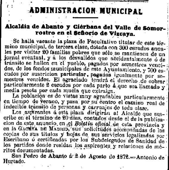 Ayuntamiento de Balmaseda, año 1847. Aquí se solicitaba plaza de cirujano (lo que sería actualmente un enfermero). Indicaba la posibilidad de contratar "mancebos" (ayudantes) para "afeitar, sangrar, poner sanguijuelas y demás" lo que indica que aun se mantenía la antigua técnica de sanación basada en sangrías. En aquellos tiempos Balmaseda contaba según el anuncio, con 340 a 350 vecinos, tenía hospital y un convento de monjas Franciscas. El cirujano era "romancista". Se decía de aquellos cirujanos que no habían pasado por la universidad y por lo tanto no sabían latín que era el idioma de la enseñanza. Por ello sólo sabían "romance", en nuestro caso castellano.